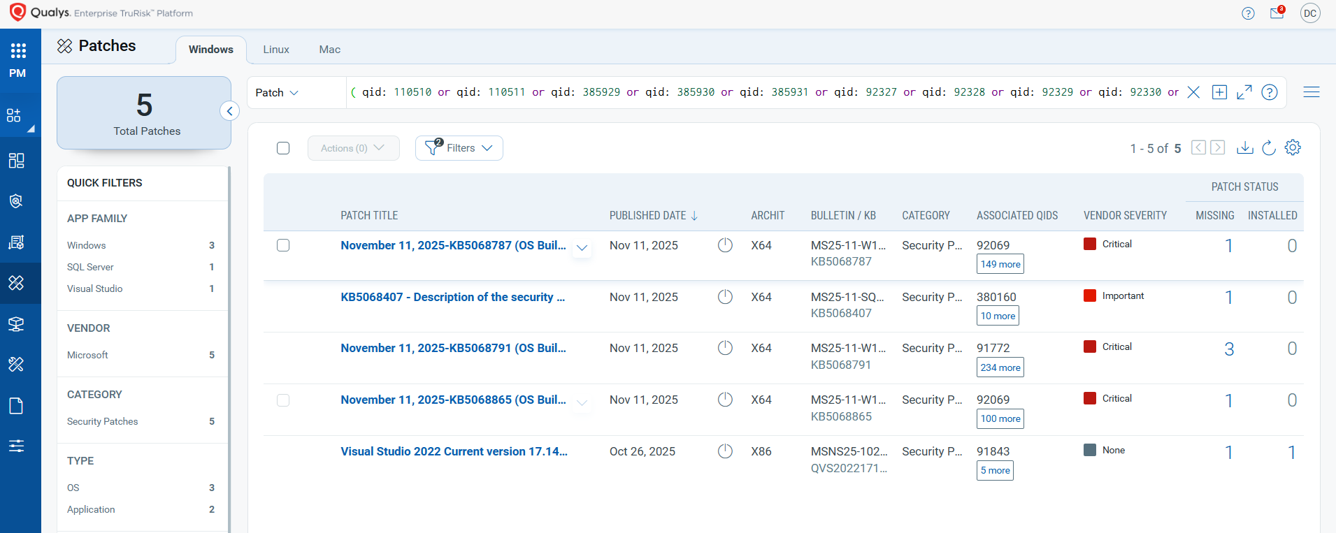 VMDR rapidly remediates Windows hosts by deploying the most relevant and applicable per-technology version patches. You can simply select respective QIDs in the Patch Catalog and filter on the “Missing” patches to identify and deploy the applicable, available patches with one click.