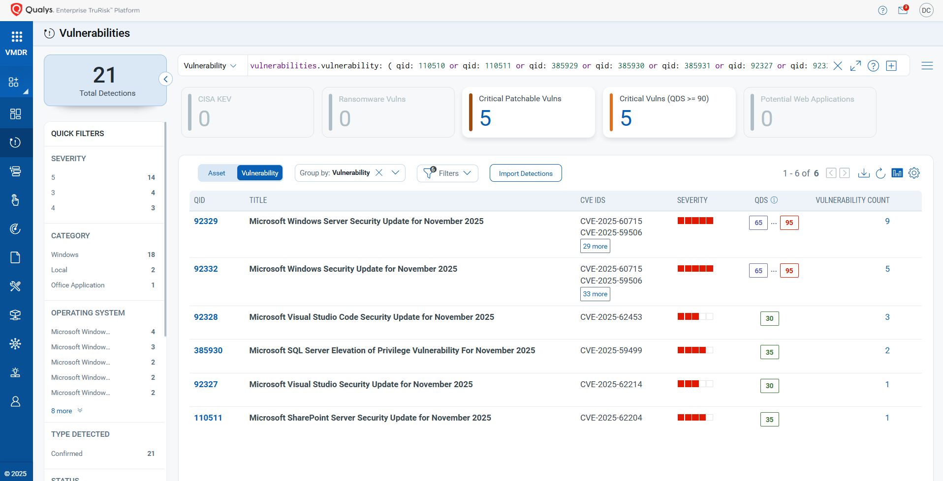 Qualys VMDR automatically detects new Patch Tuesday vulnerabilities using continuous updates to its Knowledgebase (KB).