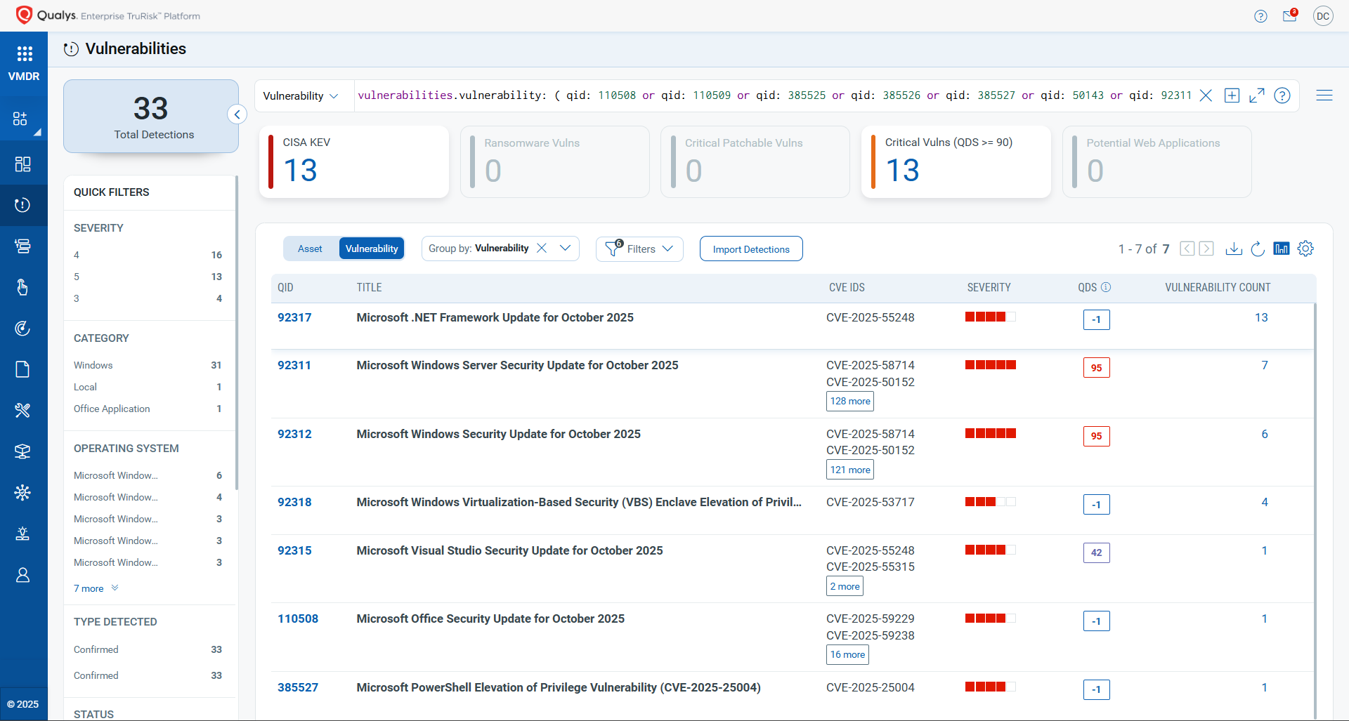 Qualys VMDR automatically detects new Patch Tuesday vulnerabilities using continuous updates to its Knowledgebase (KB).